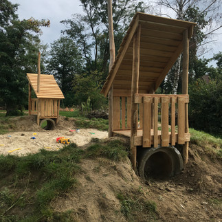 De nieuwe speeltoestellen zijn geplaatst. Twee kleutertorentjes, een kleuterglijbaan, een mikado van boomstammen en een